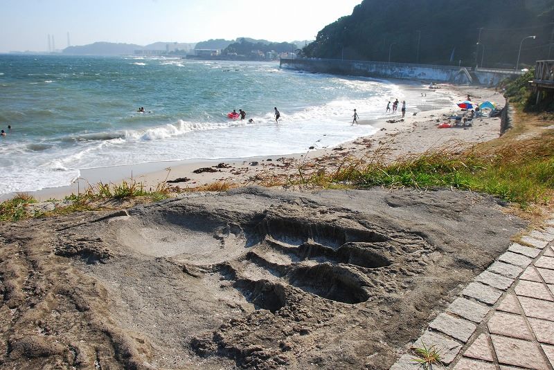 三浦半島では数少ない、白砂の浜辺です。昭和29年、初代ゴジラがこの浜辺に姿を現わしました。現在では、その足跡が残されています。